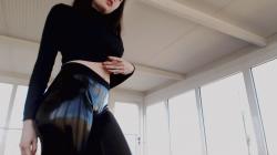 Ti mostro le mie gambe e cosce lunghe che indossano delle autoreggenti nere velate 20 den, i miei piedi bianchi smaltati di rosso attraverso il nylon, il mio culo rotondo di cui si intravedono chiaramente le forme in questo vestito aderente e che spunta dallo spacco ad ogni mia lenta movenza, proprio di fronte a te. *(Senza audio!)*